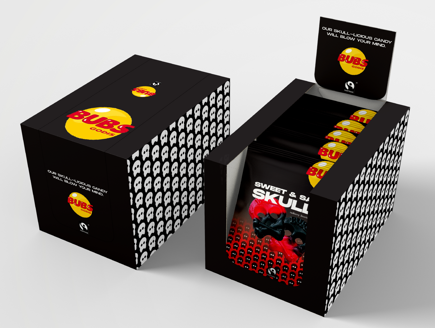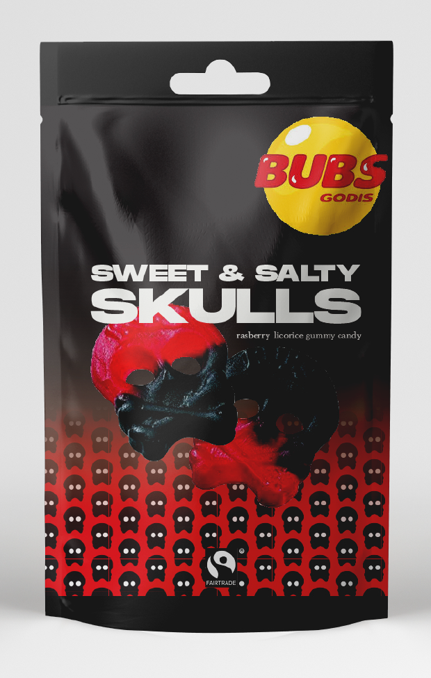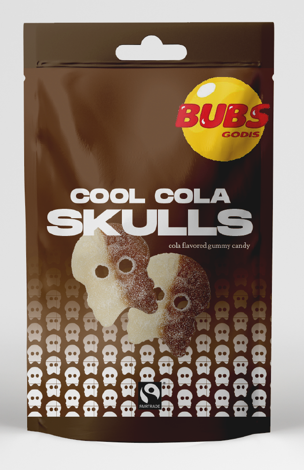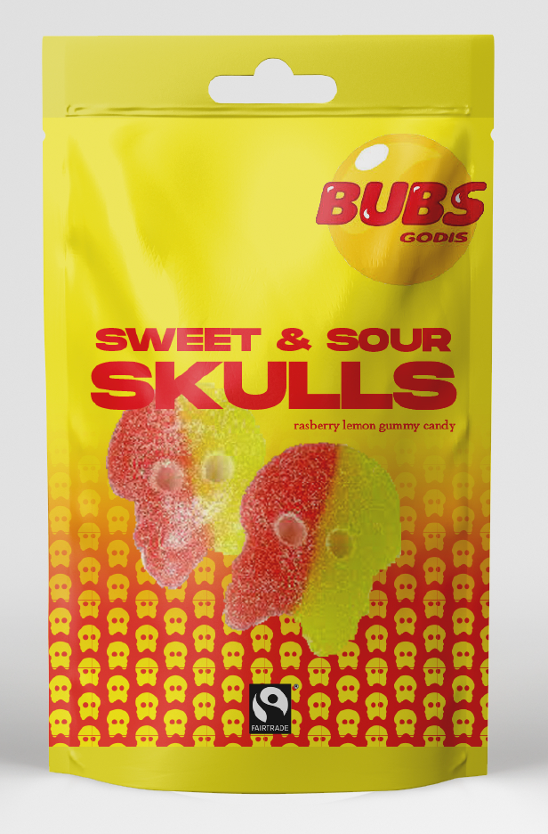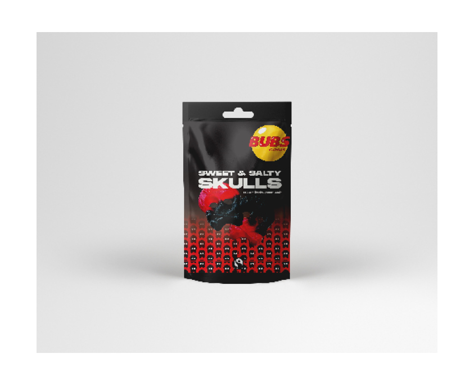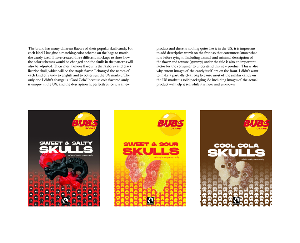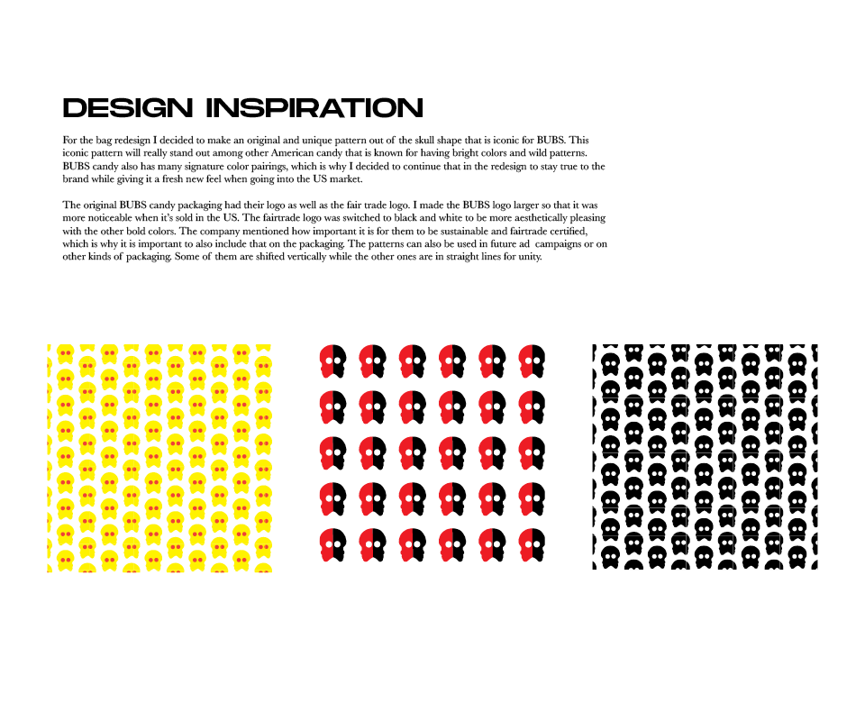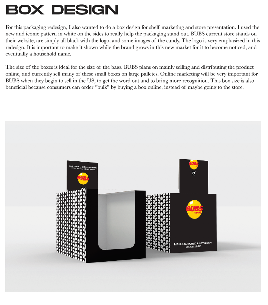 On the front of the box, above the Fairtrade, and the BUBS logo, I added a new slogan: “our skull-licious candy will blow your mind”. This is making a play of words using “skull” and “delicious”. Most US candy brands have fun and silly slogans that are catchy so the consumer sees and remembers them along with the brand.
